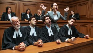 DALL·E 2023-10-20 08.56.24 – High-resolution photo inside a courtroom. Three judges of varied genders and descents are seated at the elevated bench, each showing signs of sleepine