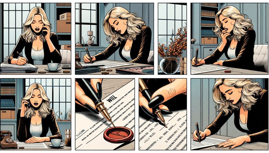 DALL·E 2023-10-27 08.53.54 – Comic strip in 8K resolution with multiple frames. Frame 1_ Interior of a contemporary room with a blonde woman sitting at a desk, deep in thought, wi
